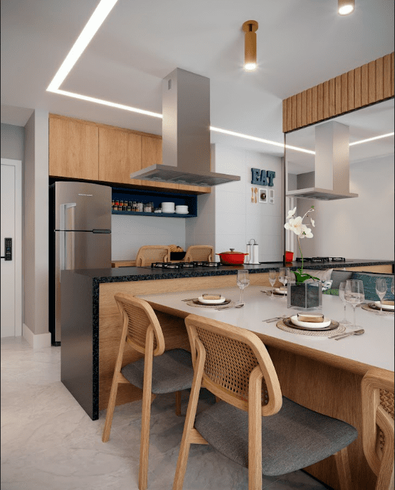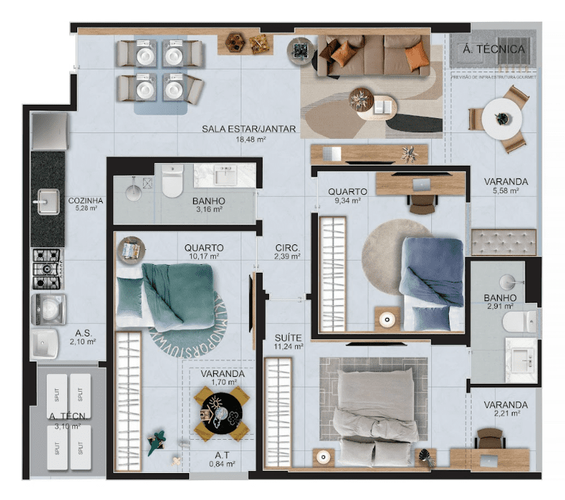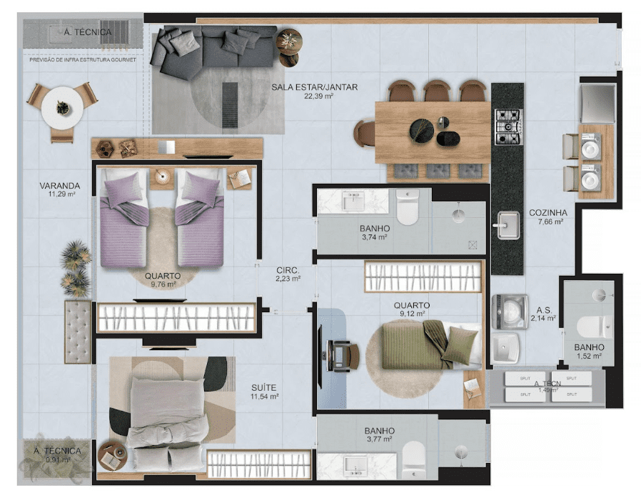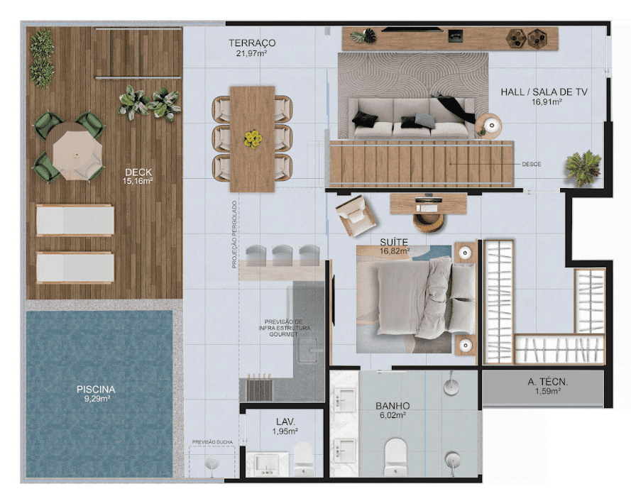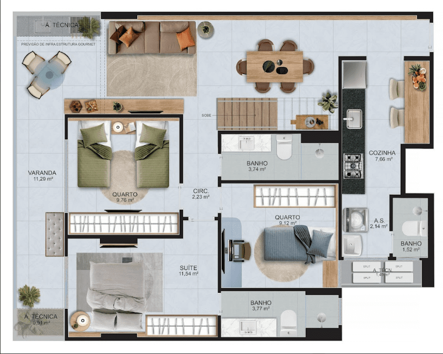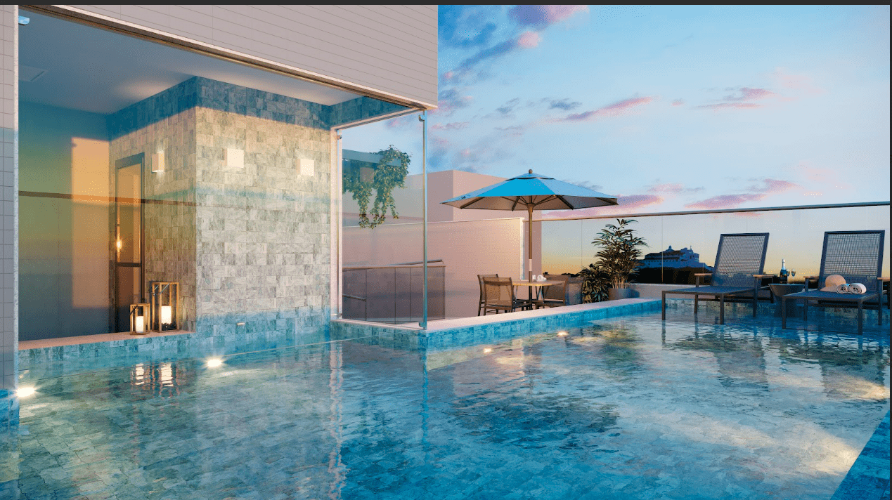 Com 04 quartos com 02 suítes (duplex) de 193,55 metros quadrados.